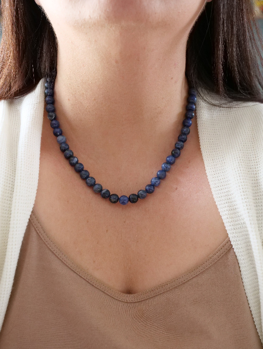 Sodalite 8mm Beaded Natural Gemstone Sterling Silver Necklace, Genuine Top Grade Gift Jewelry, Women Men Fashion Crystal Energy Jewellery