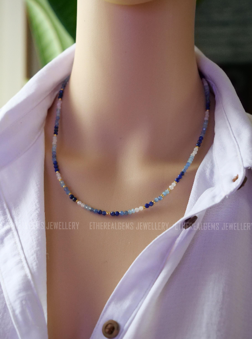 Lapis Lazuli Kyanite Aquamarine Moonstone Necklace, Beaded gemstone necklace, Mix gemstone necklace, Blue Ombre necklace, March Birthstone