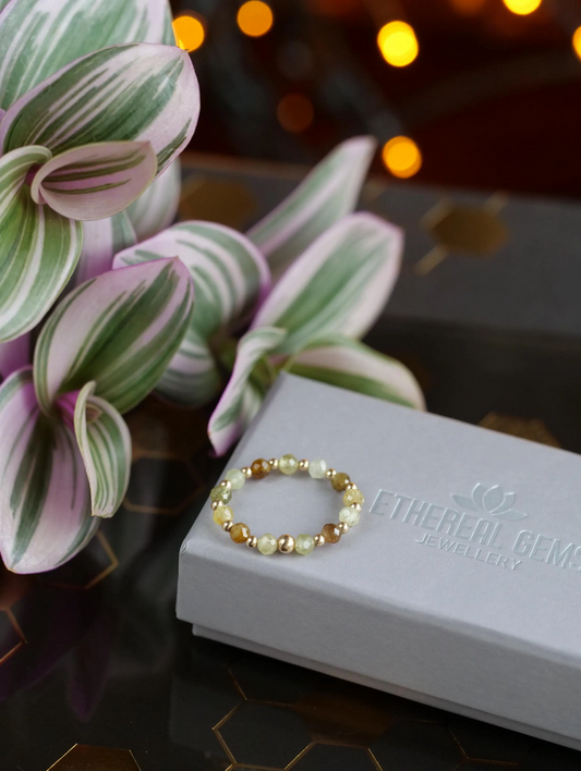 Andradite Garnet 3mm Beaded Natural Gemstone Sterling Silver/14ct Gold Filled Elastic Ring, Genuine Top Grade Gift Jewelry, Women Jewellery