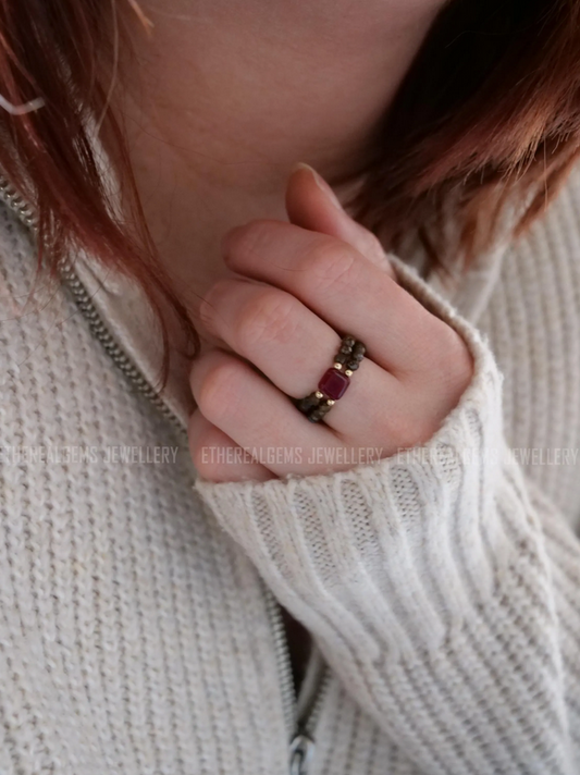 Almandine Garnet 3mm Beaded Natural Gemstone Sterling Silver/14ct Gold Filled Elastic Ring, Genuine Top Grade Gift Jewelry, Women Fashion Jewellery