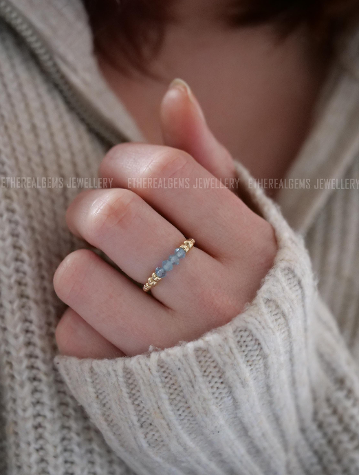 Aquamarine 3mm Beaded Natural Gemstone Sterling Silver/14ct Gold Filled Elastic Ring, Genuine Top Grade Gift Jewelry, Women Fashion Jewellery