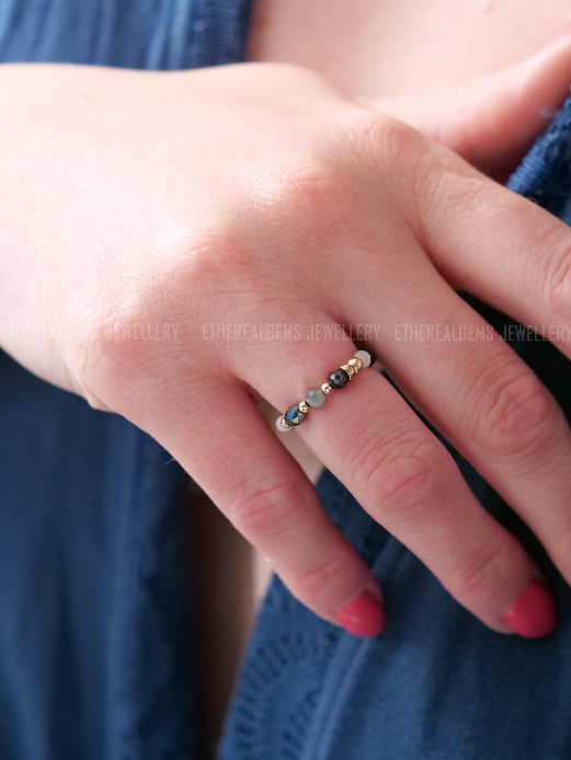 Black Tourmaline 3mm Beaded Natural Gemstone Sterling Silver/14ct Gold Filled Elastic Ring, Genuine Top Grade Gift Jewelry, Women Jewellery