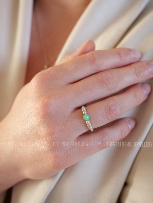 Chrysoprase Beaded Natural Gemstone Sterling Silver/14ct Gold Filled Elastic Ring, Genuine Top Grade Gift Jewelry, Women Fashion Jewellery