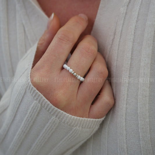Howlite 3mm Beaded Natural Gemstone Sterling Silver/14ct Gold Filled Elastic Ring, Genuine Top Grade Gift Jewelry, Women Fashion Jewellery