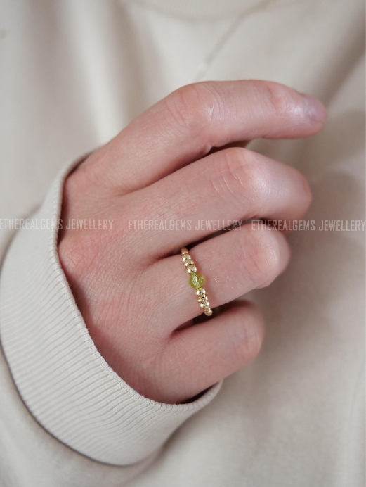 Peridot Beaded Natural Gemstone Sterling Silver/14ct Gold Filled Elastic Ring, Genuine Top Grade Gift Jewelry, Women Fashion Jewellery