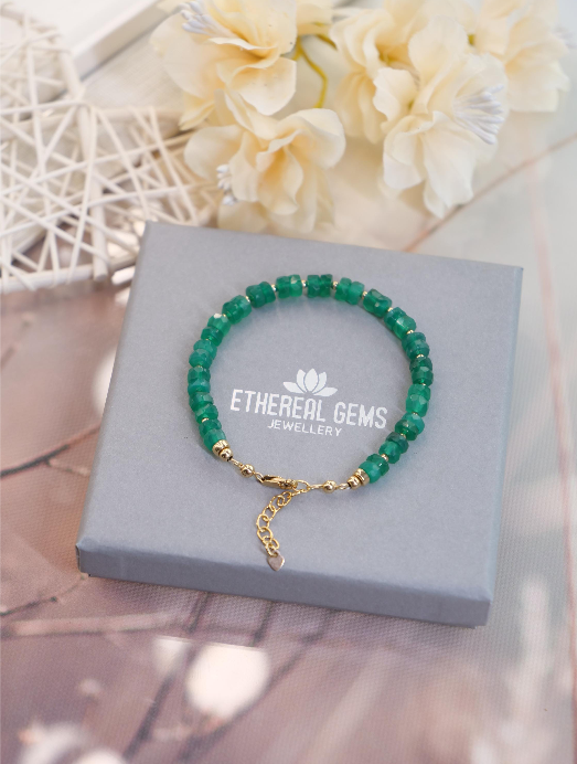 Green Onyx 5 mm Beaded Natural Gemstone Sterling Silver / 14ct Gold Filled Elastic Bracelet, Genuine Top Grade Gift Jewellery, Women Jewelry