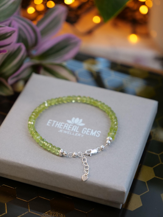 Peridot 5 mm Beaded Natural Gemstone Sterling Silver / 14ct Gold Filled Elastic Bracelet, Genuine Top Grade Gift Jewellery,August Birthstone