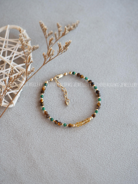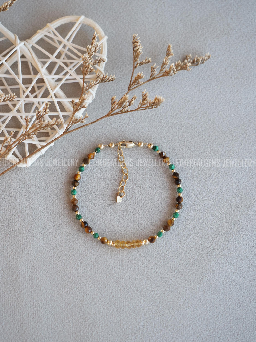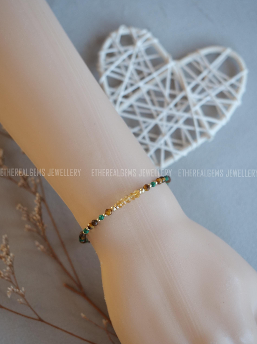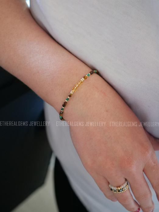 3-4mm Tiger's Eye Malachite Citrine Beaded Natural Mix Gemstone Sterling Silver / 14ct Gold Filled Elastic Bracelet, Multicolour bracelet