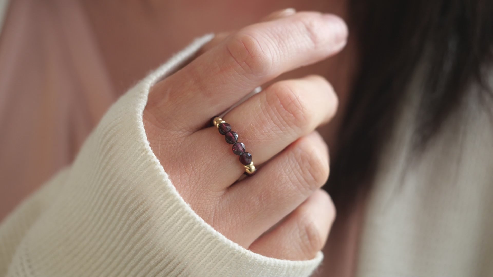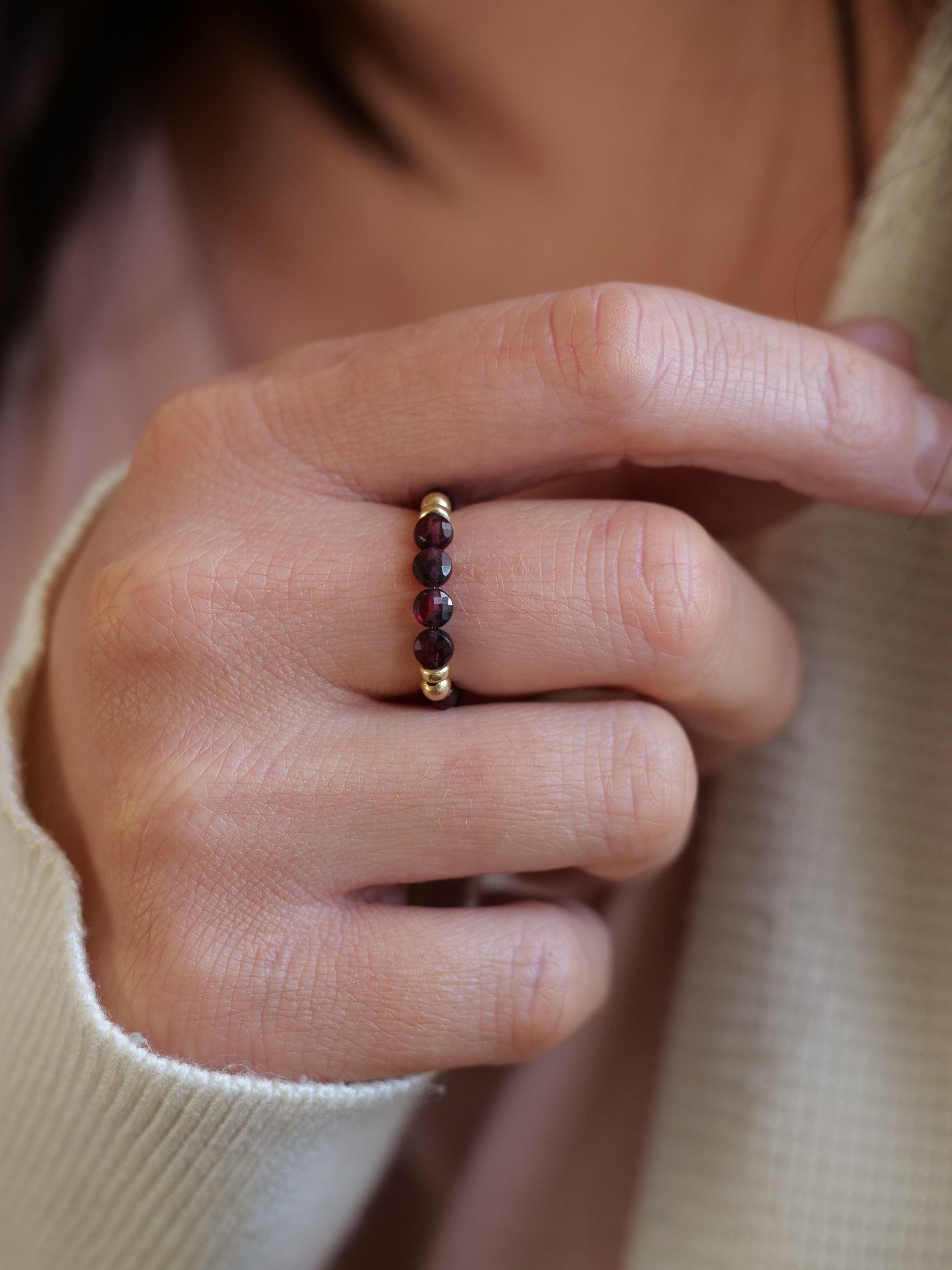 Almandine Garnet 3mm Beaded Natural Gemstone Sterling Silver/14ct Gold Filled Elastic Ring, Genuine Top Grade Gift Jewelry, Women Fashion Jewellery
