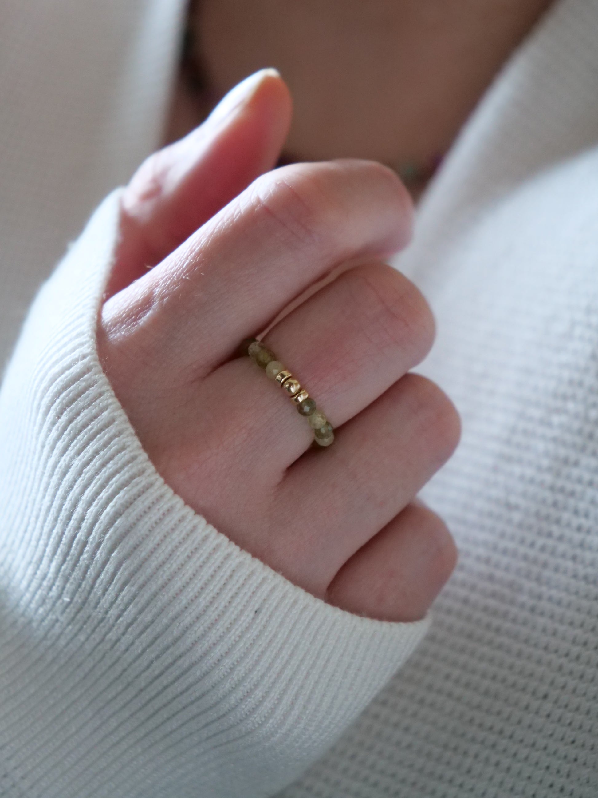 Andradite Garnet 3mm Beaded Natural Gemstone Sterling Silver/14ct Gold Filled Elastic Ring, Genuine Top Grade Gift Jewelry, Women Jewellery