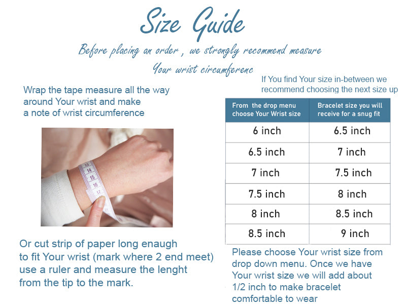 Once we have your wrist size we will add about 1/2 inch (1.30cm) to this size to make the bracelet comfortable to wear.