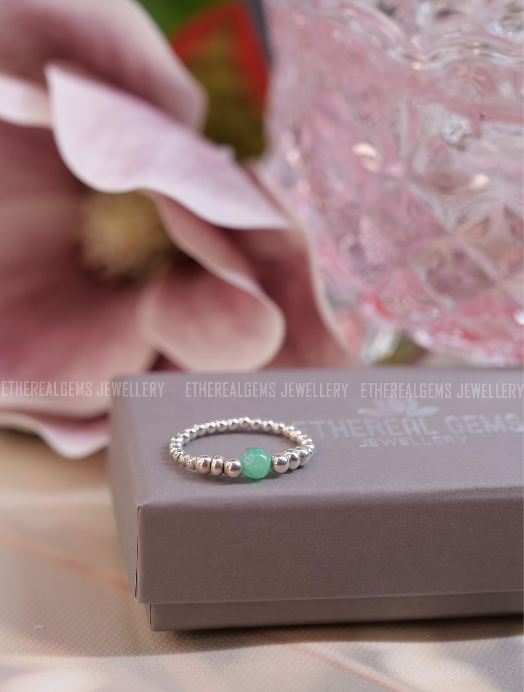 Chrysoprase Beaded Natural Gemstone Sterling Silver/14ct Gold Filled Elastic Ring, Genuine Top Grade Gift Jewelry, Women Fashion Jewellery
