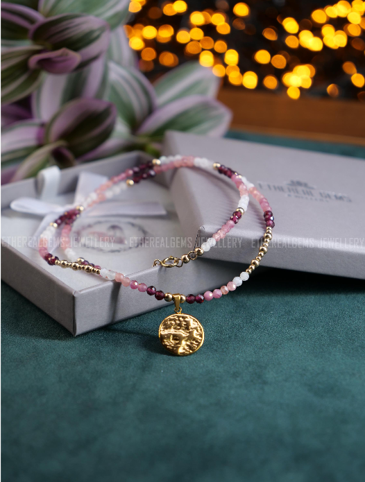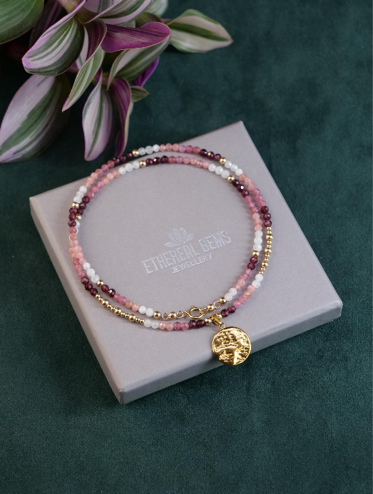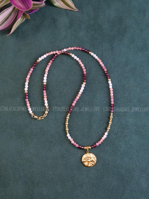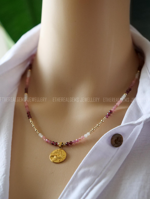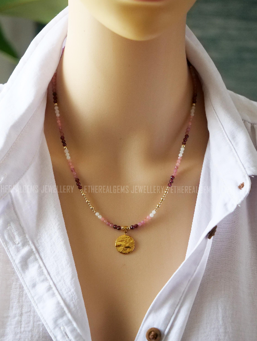 Garnet Tourmaline Rhodochrosite Moonstone Necklace, Beaded gemstone necklace, Mix gemstone necklace, Pink Ombre necklace, Love gemstone