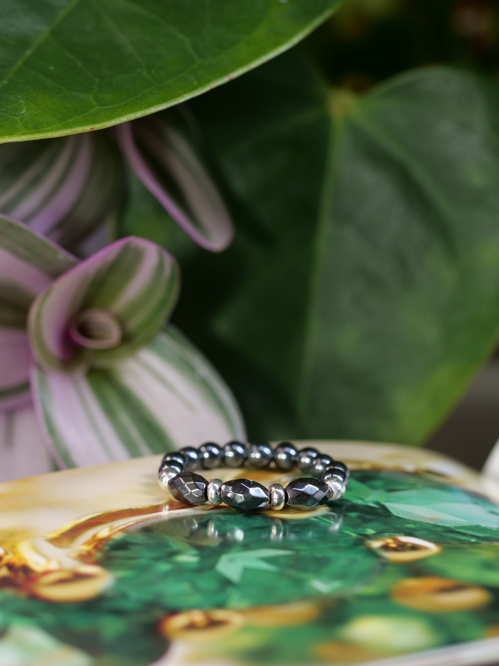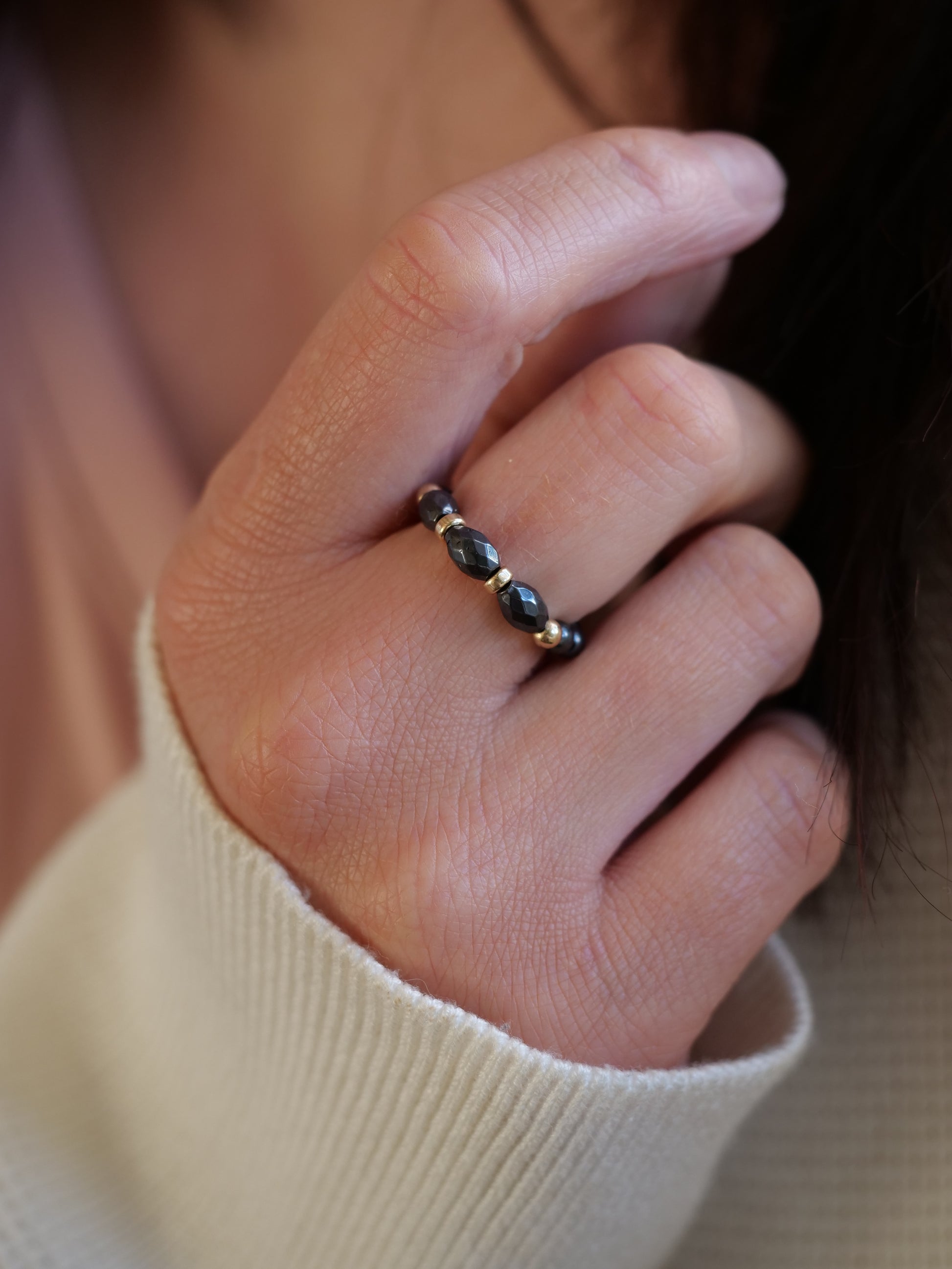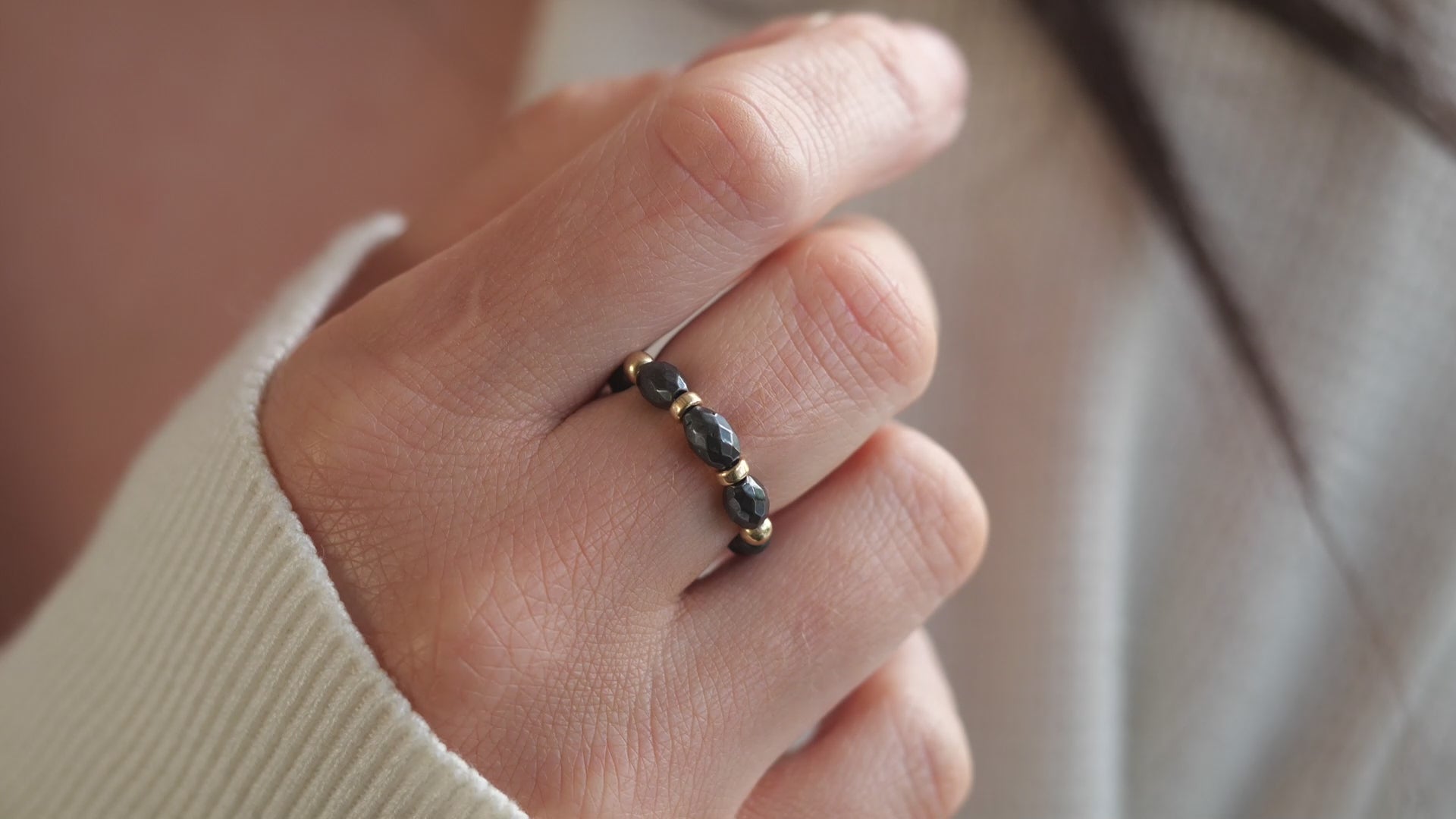 Hematite 3mm Beaded Natural Gemstone Sterling Silver/14ct Gold Filled Elastic Ring, Genuine Top Grade Gift Jewelry, Women Fashion Jewellery
