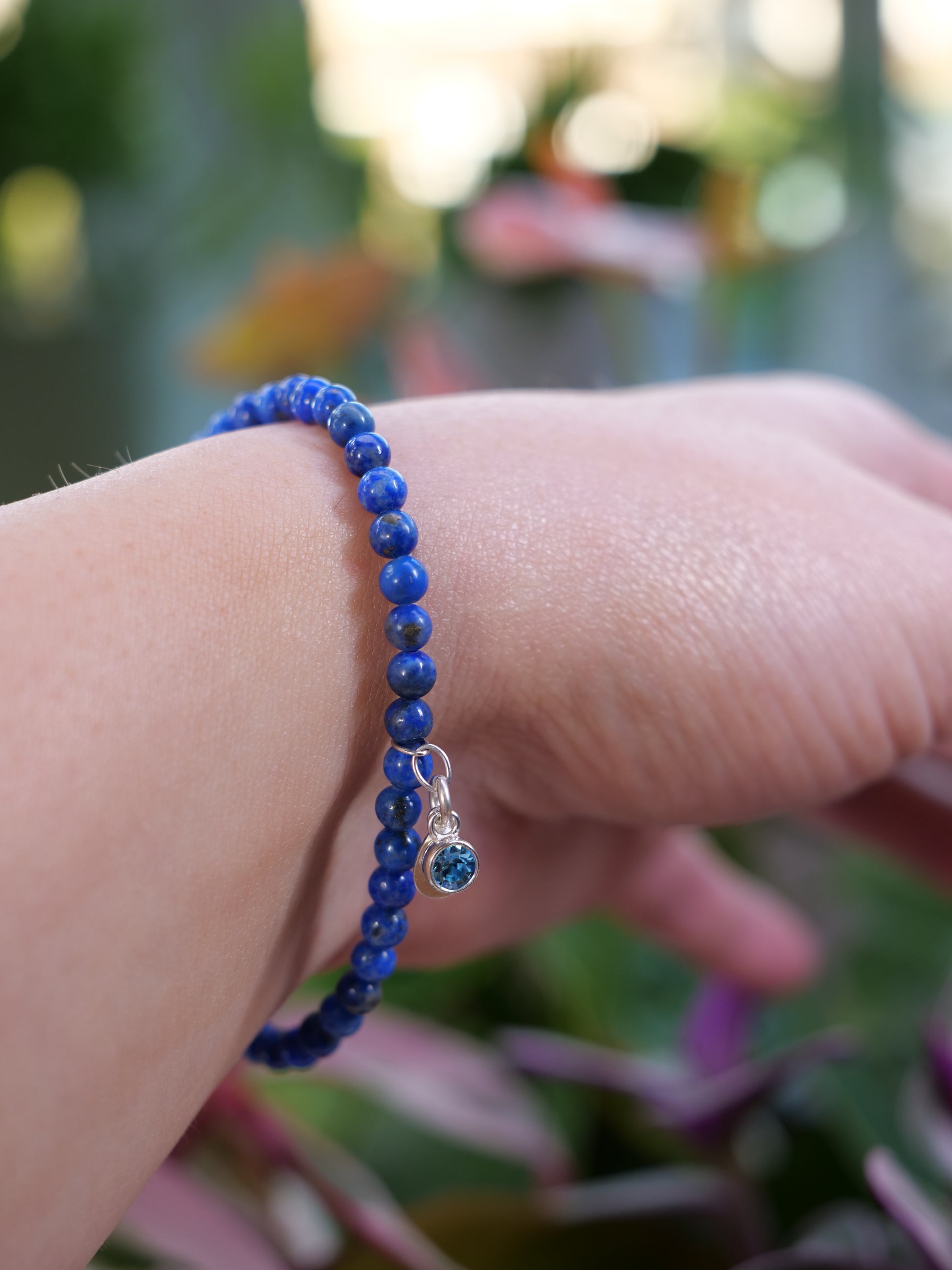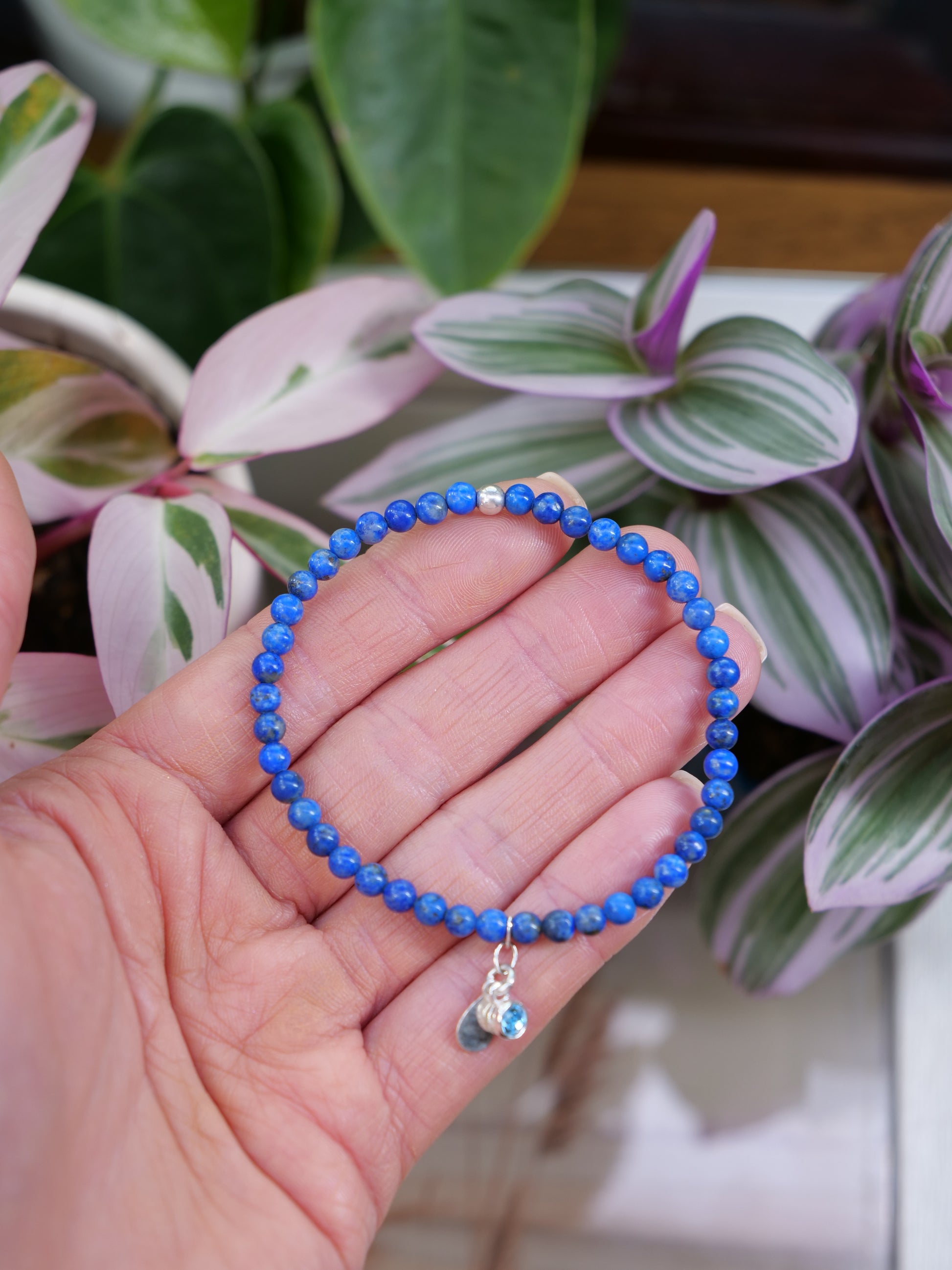 Lapis Lazuli 4mm Beaded Natural Gemstone Sterling Silver Elastic Bracelet, Genuine Top Grade Gift Jewelry, Women Fashion Jewellery
