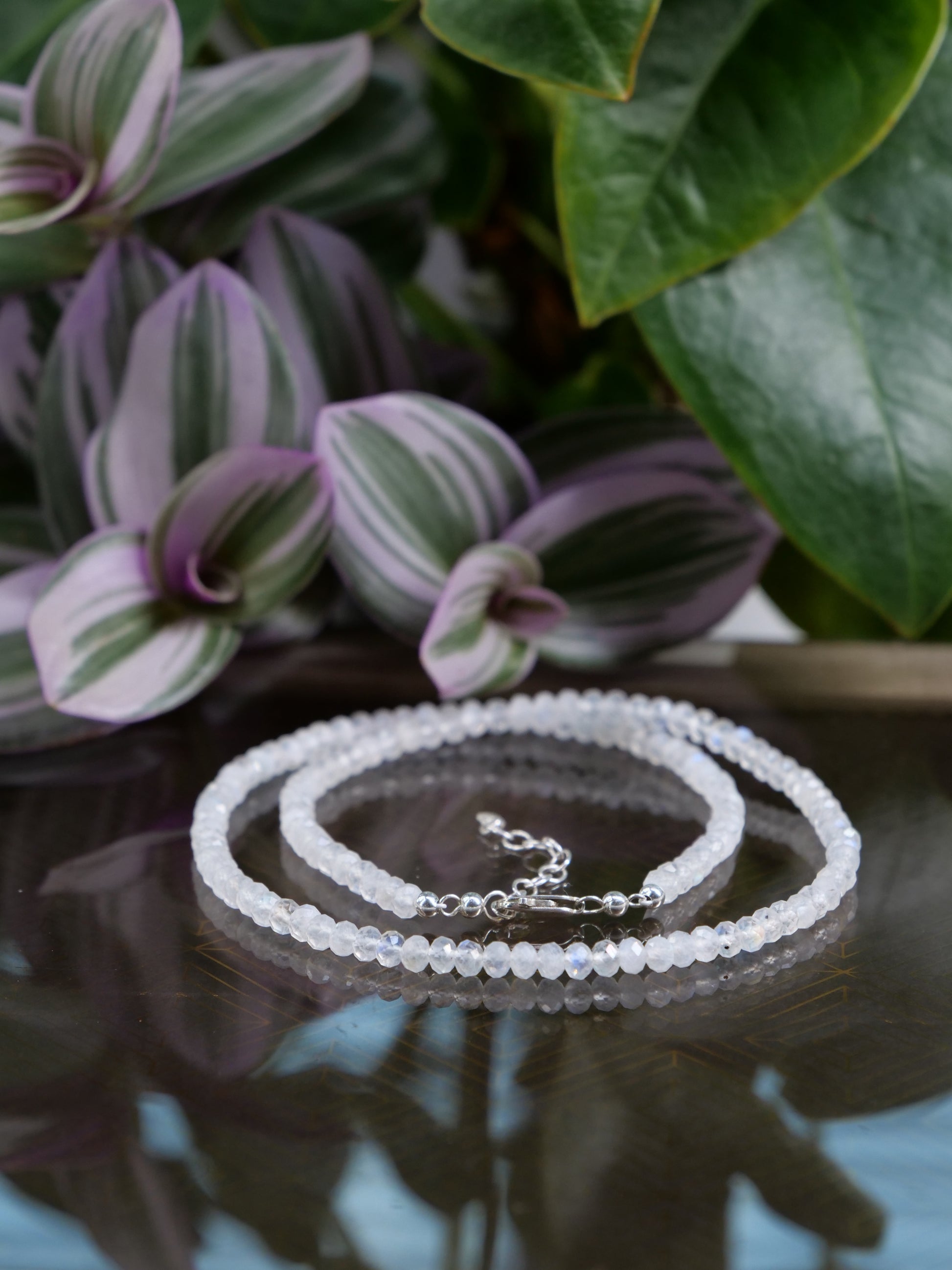 Moonstone Rainbow 4mm Beaded Natural Gemstone Sterling Silver Necklace, Genuine Top Grade Gift Jewelry, Women Fashion Jewellery