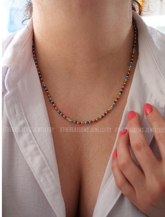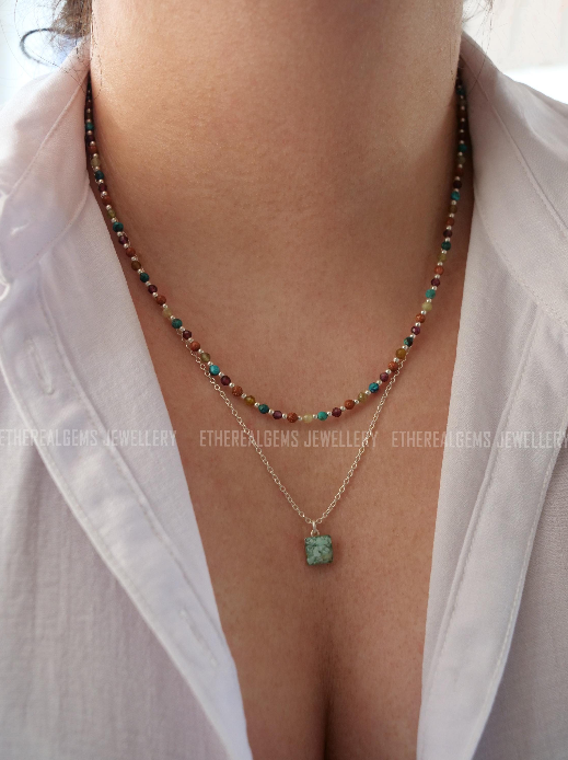 Vintage vibe necklace, 3mm Tiny Gemstone Necklace, Summer vintage necklace, Silver beaded Chrysocolla Garnet Goldstone Gemstone Necklace