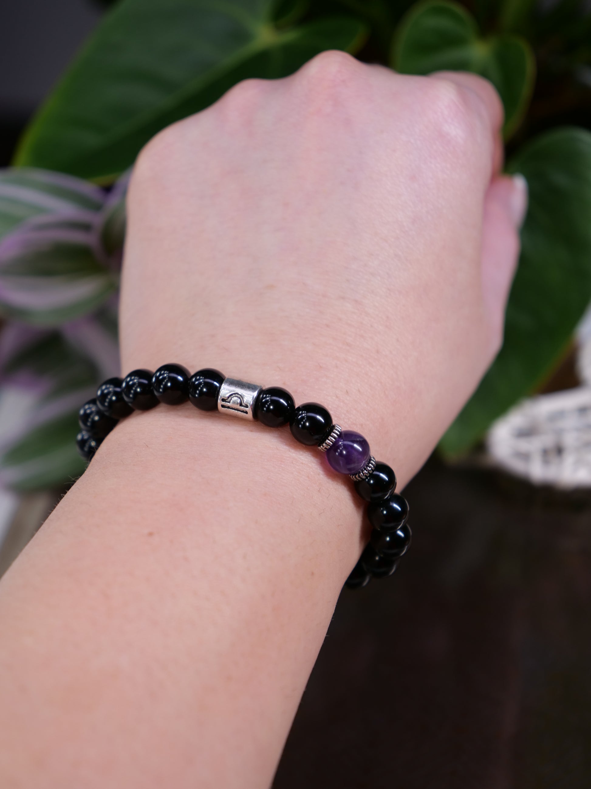 Zodiac Black Onyx Amethyst 8mm Beaded Natural Gemstone Elastic Bracelet, Genuine Top Grade Jewelry, Men Women Fashion Jewellery